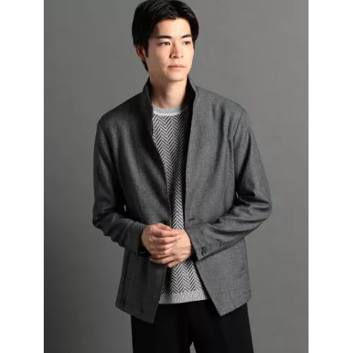 ポリエステル素材ならではの仕立て映えするハリ感とストレッチのあるストレスフリーな着心地が特長。家庭洗濯可能でシワになり辛く、速乾性のあるイージーケア性も魅力です。